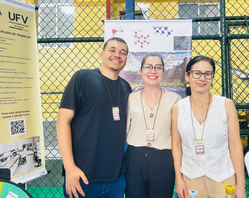 As professoras Ana Paula Guimarães e Lis Regiane Vizolli Favarin, da Comissão Coordenadora do Curso de Licenciatura em Química, e os alunos: Anelise Andrade Machado, Matheus Marcos Machado Calixto e Pedro Henrique Coutinho da Silva participaram da Mostra de Profissões de uma escola de Educação Básica de Viçosa, realizada nos dias 23 e 24 de setembro. Agradecemos pela colaboração!